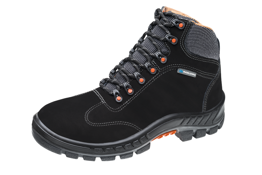 Bota de segurança da linha Premier, em microfibra, na cor preta e ilhós nas cores grafite e laranja, indicada para profissionais de áreas elétrica, administrativas, indústria de baixo risco, lazer e esportes leves ou prestadores de serviços.